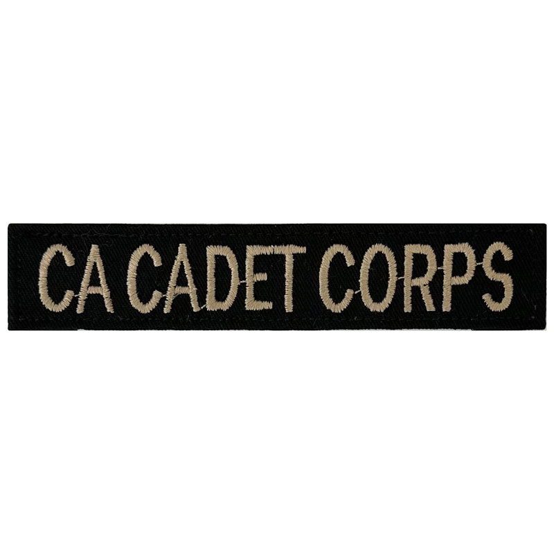 Black name tape embroidered with CA CADET CORPS in coyote thread. This name tape is for the California Cadet Corps (CCC) uniform. Comes with hook back to attach to the loop tape already on the uniform.