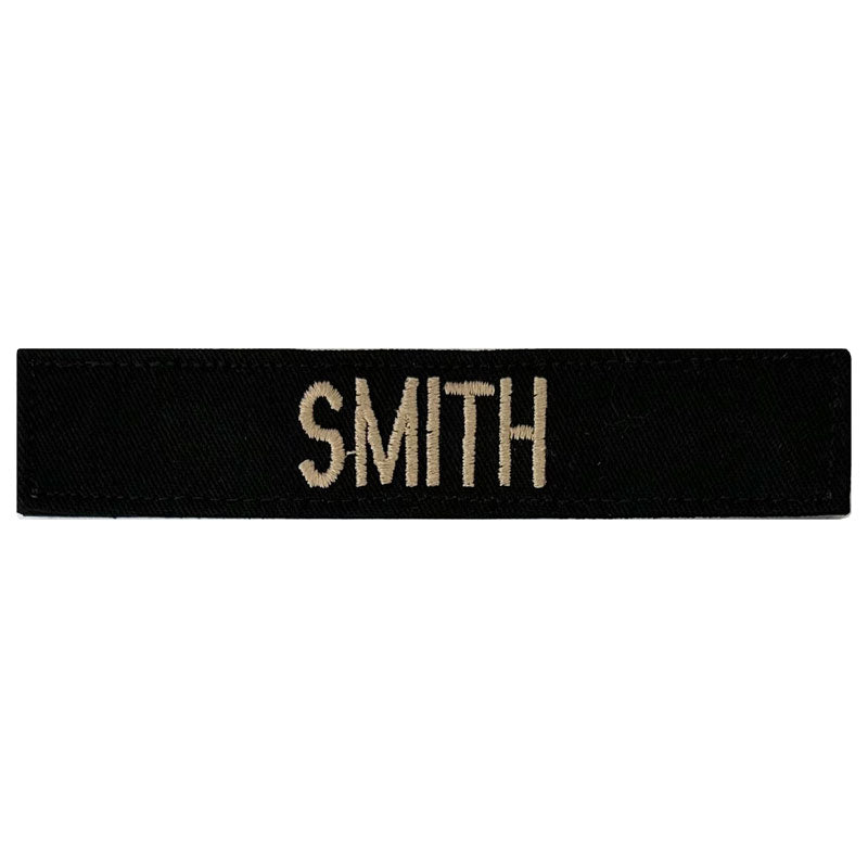 Black name tape embroidered with your last name in coyote thread. This name tape is for the California Cadet Corps (CCC) uniform. Comes with hook back to attach to the loop tape already on the uniform.