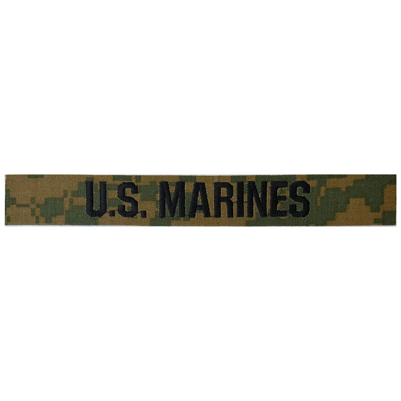 U.S. MARINES embroidered on a Woodland MCCU pattern marine name tape